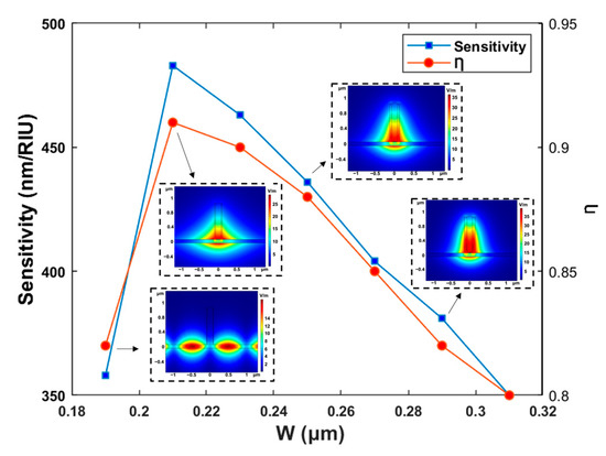 Figure 4 illustrates the influence of the total waveguide width on sensitivity and Ƞ, and the optical field distribution corresponding to = 190 nm, = 210 nm, = 250 nm, and = 290 nm. When was selected as 190 nm, the waveguide was unable to meet the single-mode condition and form slot waveguides. When W was adopted to be 210 nm, the optical field leaked from the slot waveguide, which led to a poor optical power ratio. Stable single-mode operation was produced when was selected as 250 nm, and there was no significant influence on the optical field distribution when increasing to 290 nm. In addition, the data in Figure 5 show that the sensitivity and Ƞ of the waveguide decreased with the increase in the total width of the waveguide. The = 250 nm was adopted to form a stable slot waveguide mode with high sensitivity and Ƞ.