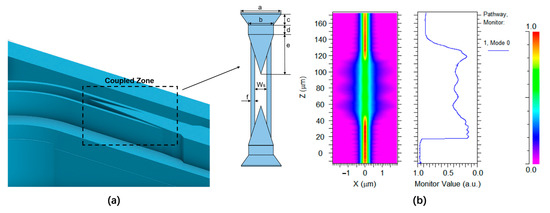 The slot waveguide was adopted for the proposed microring-based sensor to improve the sensitivity of the sensor. However, the coupling loss and transmission loss of the slot waveguide were higher than those of the straight waveguide due to its non-Gaussianity. Therefore, an efficient mode converter was adopted to achieve the mode conversion from the strip waveguide into the slot waveguide. The diagram of the tapered mode converter is shown in Figure 5a. To reduce the mode mismatch and improve the coupling efficiency, taking the structural parameters, the posterior end of taper width = 0.4 μm, the fore part of taper width b = 0.32 μm, the length of taper c = 8 μm, the length of the transition waveguide d = 13 μm, the length of the slot-inserted taper e = 42 μm, the width of the slot waveguide = 0.15 μm, and the waveguide width on both sides of the slot f = 0.05 μm. The energy loss was 0.38 dB, and the optical field distribution is shown in Figure 5b.