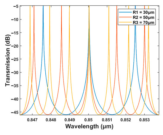 Transmission characteristics at the drop port of the microring resonator under different radiuses.