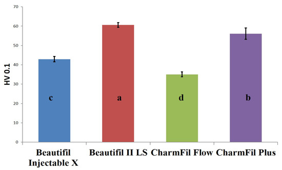 30]. In this study, we used materials with two different types of fillers. Charmfil Flow and Charmfil Plus contain a nano-hybrid type of filler with a filler load of more than 70 wt% (as per the manufacturer). On the other hand, Beautifil injectable X and BeautifilII LS contain S-PRG-type filler with a filler load of approximately 82.9%. Despite the use of the same type and wt% within materials from the same manufacturer, the flowable version of the material of both nano-hybrid and S-PRG filler showed a significantly lower VH value compared to its counterpart of the same brand. A widely accepted explanation for this result is the compositional variation of flowable composites from packable types that significantly lowers the VH value [