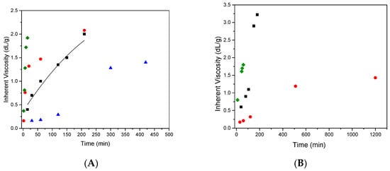 Dependence of inherent viscosity of the obtained polybenzimidazoles on the reaction time for (A) OBPI using standard ER at 100 °C (▲), 140 °C (●),180 °C (♦), and in 30/70 TFSA/MSA at 100 °C (▪); for (B) CF3PBI in ER at 140 °C (●), 180 °C (♦) and in 50/50 TFSA/MSA at 140 °C (▪). The data obtained in standard ER were taken from our previous results [32,44].