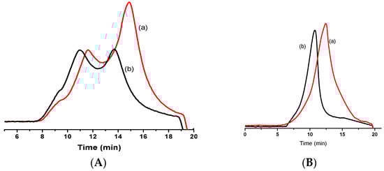 GPC traces of (A) OPBIs obtained in 30/70 TFSA/MSA at 100 °C in (a) 60 min, (b) 240 min; (B) CF3PBIs obtained in 50/50 TFSA/MSA at 140 °C in (a) 40 min, (b) 180 min.