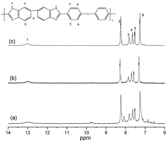Figure 3 shows the evolution of the 1H NMR spectra during the synthesis of OPBI in TFSA/MSA = 30/70 at 100 °C. As can be seen, after 120 min of the reaction (Figure 3b), the spectrum confirms the formation of a linear OPBI with completely closed imidazole cycles. Aside from the characteristic N-H signal of imidazole is observed at 13 ppm, and the signals from aromatic protons appear in the area between 7 and 8.5 ppm, in accordance with the literature [32,48,49,50], no additional signals were detected. Longer reaction time did not lead to any changes in the spectrum (Figure 3c), however, the sample taken after 60 min of the reaction demonstrated several additional signals in the spectrum (Figure 3a) meaning incomplete cyclization.