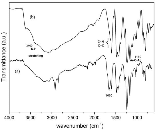The FTIR spectra of these samples were also different as shown in Figure 4, although one could find the characteristic bands for benzimidazole in both spectra, in the 1400–1650 cm−1 and 2400–3500 cm−1 areas as described above. The FTIR spectrum of the fully cyclized OPBI (after 240 min raction time, Figure 4b is practically identical to the OPBI spectra described before [32,49]. In comparison with the spectrum of the incompletely cyclized polymer (Figure 4a), it contains lesser amounts of bands, and the bands look better resolved. Such that, the two closely located bands may be distinguished at 1630 and 1600 cm−1 in the spectrum associated with C=C/C=N stretching, and the vibration of the imidazole-benzene conjugated system, respectively [22,47]. These vibrations are included within one broad peak at 1660 cm−1 in the spectrum (a) (Figure 4). It is important to stress that no residual carbonyl (C=O) peak between 1720 and 1650 cm−1, which is generally used to detect an incomplete cyclization, was observed in the spectrum of the polymer, even after a 30 min reaction time. The other characteristic benzimidazole bands, including the absorptions at 1480 and 1440 cm−1 that correspond to the in-plane ring vibrations of the substituted benzimidazole, at 1280 cm−1 attributed to the imidazole ring breathing mode, and at 800 cm−1 due to the heterocyclic-ring vibration and the C-H out-of-plane bending [22,47] are readily detectable in Figure 4b. These characteristic bands are also present in the spectrum 4 (a), but they are not well pronounced because of the presence of other additional vibrations. The strong bands at 1240 and 1170 cm−1 are assigned to the vibration of Ar–O–Ar [32,49].