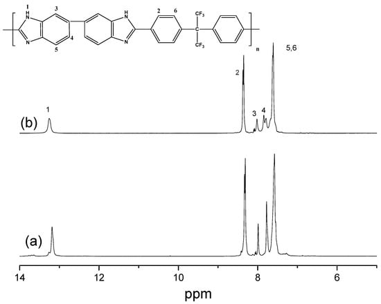 In contrast to OPBI, the formation of a benzimidazole ring in CF3PBI occurred very fast under the polymerization conditions. As can be concluded from Figure 5, where 1H NMR spectra of the polymer samples taken in different reaction times are presented, CF3PBI had a fully cyclized structure after 40 min of the polymerization in 50/50 TFSA/MSA mixture at 140 °C. The spectra of the samples taken at 40 min (Figure 5a) and at 180 min (Figure 5b) are identical and demonstrate all the characteristic signals of CF3PBI: (ppm) 13.22 (1H), 8.39–8.36 (2H), 8.09 (3H), 7.83 (4H), and 7.64–7.62 (5,6H) according with the literature [12,32,51]. However, the molecular weights of the polymer increased very significantly during this period of time (See Figure 1B), therefore, it may be concluded that the growth of the polymer chain and cyclization for CF3PBI proceeded simultaneously under these reaction conditions. This may be a reason for the monomodal and narrow distribution of the molecular weights observed for this polymer, since the presence of the uncyclized units mostly leads to ramifications or other undesirable side reactions.