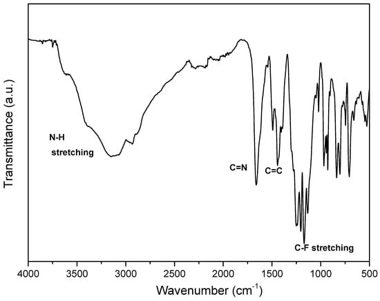 The FTIR spectrum of CF3PBI (Figure 6) looks very similar to those reported earlier for this polymer with a set of the characteristic bands, including a broad one at 3500–2800 cm−1 due to stretching vibrations of the bounded -NH--H groups, absorptions observed in the 1650–1380 cm−1 region attributed to the C=C/C=N stretching and some specific vibrations of benzimidazole, and a group of bands in 1260–1150 cm−1 that belong to the C-F stretching [12,32,34,52]. The peaks in the spectrum are better resolved than generally reported because of the still low molecular weight of CF3PBI, however, they clearly confirm the benzimidazole structure.