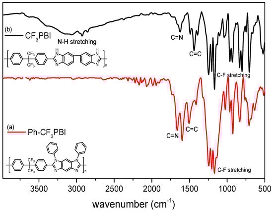 Inspired by the fast cyclization observed for CF3PBI in the modified-with-TFSA ER, we repeated our attempts to synthesize a N-phenyl substituted PBI using Ph-BET and HFA. The polymerization conditions were slightly modified in comparison with those applied to the synthesis of CF3PBI, but the soluble polymer labeled as Ph-CF3PBI with ƞinh = 0.91 was obtained. The FTIR spectrum of Ph-CF3PBI, depicted in Figure 7a, exhibits the main absorptions in two areas: 1660–1400 and 1250–1100 cm−1, that are characteristic for PBIs based on HFA. The difference observed in these regions between spectra of Ph-CF3PBI and CF3PBI should be attributed to the vibrations derived from the aryl substituent groups (spectra (a) and (b) in Figure 7). On the other hand, it is important to stress that the area of the characteristic vibrations of the bounded -NH--H groups, 3500–2800 cm−1, remains essentially plane in the case of Ph-CF3PBI, meaning the absence of -NH bonds in the polymer. Only a small absorption from the aromatic CH stretching was noted at 3100 cm−1.