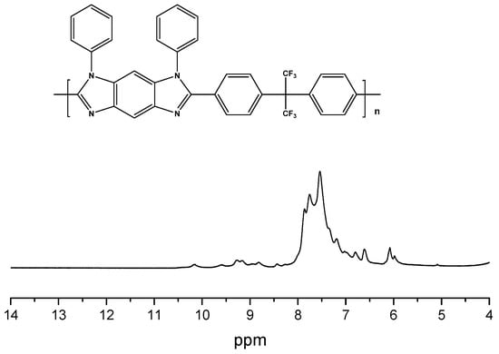 The 1H NMR study of Ph-CF3PBI (Figure 8) confirmed the conclusions made from the FTIR spectroscopy results. No signal from HN- in the 13–14 ppm region was found, only one broad poorly resolved peak from the aromatic protons was observed in the area between 7 and 8 ppm. Similar signals were observed for another N-phenyl substituted PBI, N-Ph-OPBI, which synthesis was recently reported in ER by our group [33]. However, it was not possible to obtain a completely closed benzimidazole structure and some other additional signals were seen in the 1H NMR spectrum.