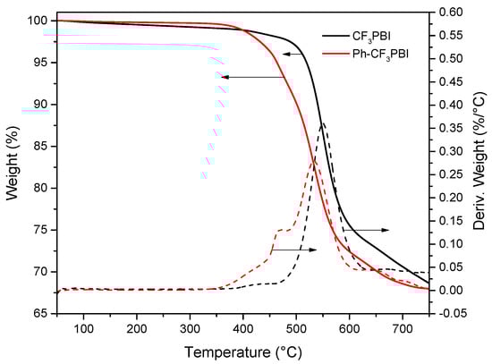 The TGA tests were performed in order to evaluate thermal stability of the newly obtained Ph-CF3PBI. Its TGA thermogram is shown in Figure 9 together with the CF3PBI thermogram. Although the Ph-CF3PBI demonstrated a high thermostability where the decomposition started above 400 °C, it was less thermostable than the CF3PBI, where the main weight loss began above 500 °C. At temperature of 500 °C Ph-CF3PBI already lost about 12% of the weight.