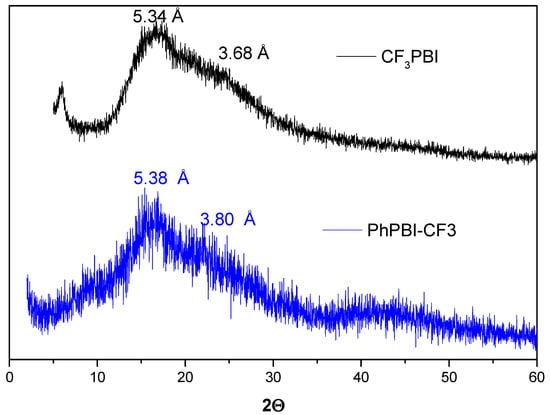Figure 10 shows the X-ray diffraction patterns for the CF3-containing PBIs. Both polymers exhibit a broad halo, meaning an amorphous structure. Calculating the d-spacing from the Bragg equation (nλ = 2dsinϴ), we can observe two distinctive peaks for both polymers around 5.3 Å and 3.7 Å that indicates a co-existence of the different types of chain packing arrangements within the same polymer matrix. There is no significant difference between the d-spacing of the polymers derived from the HFA diacid independently of the tetraamine used. This is rather explained by the high hindrance capacity generated by the C(CF3)2 group that drastically restricts packing, thus preventing any contribution from pendant phenyl substituents.