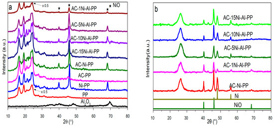 First, compositions of PP composites before and after combustion were investigated by XRD. In addition, the reduction property of PP composites was also investigated by H2-TPR. The results are presented in Section 3.1 and Section 3.2, respectively. Next, the thermal stability and residual char morphology of PP composites were investigated in detail, which are presented in Section 3.3 and Section 3.4. Then, the effects of the combined AC/NiO/Al2O3 catalyst on the flammability of PP composites were discussed from the cone calorimeter tests, and the results are presented in Section 3.5.
