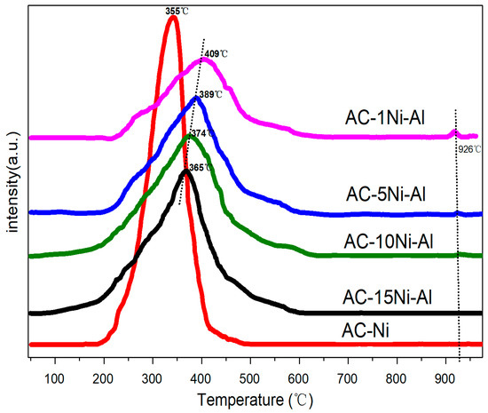 Due to CNTs being formed under the action of metallic Ni reduced from NiO, characterization of H2-TPR was carried out to investigate the reducibility of the prepared samples (Figure 3). It is known that, the higher the temperature corresponding to the peak, the more difficult it is to be reduced. The broad peaks between 200 and 500 °C are assigned to reduction of NiO [35]. It is found that the reduction peak of NiO assigned to Ni2+ is sharp and the corresponding temperature is 355 °C. After introduction of Al, the curves become less steep. Furthermore, because of the interaction between NiO and Al2O3, all of them shift toward higher temperatures from 365 to 406 °C with increasing Al amount. It is also found that there is a small peak at about 926 °C for 10Ni-1Al, 5Ni-1Al and 1Ni-1Al, which is assigned to the reduction of NiAl2O4 spinel [36]