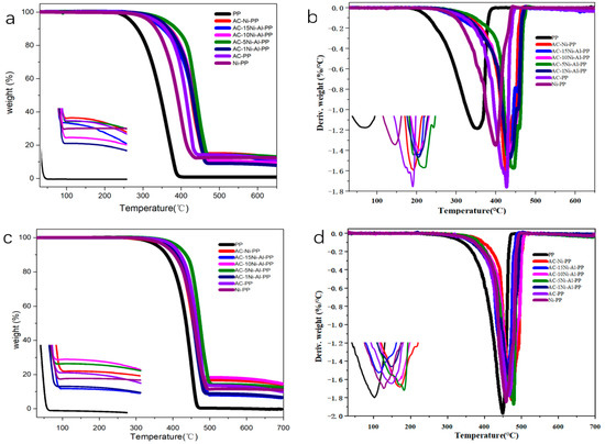 (a) TGA and (b) DTG curves of PP and its composites in air atmosphere. (c) TGA and (d) DTG curves of PP and its composites in nitrogen atmosphere.