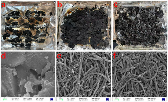 Morphology of typical composites after cone calorimeter tests is presented in Figure 5a–c. For the neat PP sample, no obvious residual char is visible due to the easily complete combustion. Small amounts of residual char (11.3 wt%) were observed from AC-PP, which is lower than that of the initial addition of 15 wt%. This is in accordance with the imitative combustion measurement. When the NiO or NiO/Al2O3 were added, large amounts of residual char were retained, which reached as high as about 40 wt%. In comparison with AC-Ni-PP, more residual char was produced from the AC-5Ni-Al-PP. SEM was used to investigate the microstructure of typical products after combustion and the results are presented in Figure 5d–f. For the AC-PP, different sizes of AC aggregate and create a variety of holes. After addition of NiO, the microstructure of AC-Ni-PP after combustion is totally different. A large amount of CNTs are observed and part is closely intertwined. This easy catalytic combustion method is allowable for large-scale production of CNTs. Unfortunately, the quality of CNTs is not excellent in that the CNTs surface is unsmooth and many bulges exist, which is also confirmed by the TEM. It is speculated that the combustion is violent and the reaction components are complex, resulting in the non-uniformity of CNTs growth. For the AC-5Ni-Al-PP, the abundant CNTs are also observed. In comparison with AC-Ni-PP, the proportion of winding CNTs is higher and intertwined phenomenon is also more severe, which is in accordance with the previous report [23]. It is interesting that only AC was added into the PP; the residual char still contains a great deal of carbon. While AC, NiO and Al2O3 were added, no abundant carbon pieces were observed. This interesting phenomenon will be further researched in the future work.