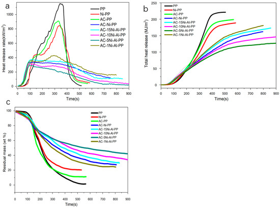 The HHR results and ignition time of PP and its composites are presented in Figure 7a and Table 4, which were conducted by cone calorimeter at 50 kW/m2. Firstly, it is observed that, after introduction of AC, the ignition time of PP composites (AC-Ni-PP, AC-15Ni-Al-PP, AC-10Ni-Al-PP, AC-5Ni-Al-PP and AC-1Ni-Al-PP) is advanced more than NiO-PP and neat PP, resulting from the fact that AC promotes the cracking ability of PP fragment radicals into light hydrocarbons [32]. It is also observed that the neat PP shows the sharpest increase and decline for HRR curve, and the PHRR value reaches 1197 kW/m2. In comparison with pure PP, the PP modified by NiO or AC alone shows similar peak type with lower HRR values due to the carbonization reaction catalyzed by NiO. For the composites modified by AC, NiO or Al2O3 simultaneously, the combustion property suffers from significant change; the PHRR declines dramatically and the type of curves becomes gentle. The PHRR value reaches as low as 301 kW/m2 for AC-5Ni-Al-PP, reduced by 76% compared to neat PP. In summary, the results indicate that no significant influence occurred when the NiO or AC exists alone. However, the combination of the binary or ternary composites (NiO, AC or Al2O3) has a remarkable effect on the combustion property, indicating the presence of a synergistic effect, which promotes the flame retardancy.