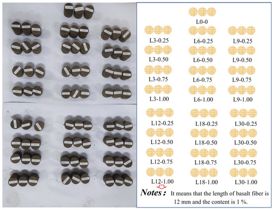 The specimens were prepared according to the “Standard for geotechnical method” (GB/T 50123-2019). According to the cement content of 15%, the water cement ratio is 0.5, the PVA fiber (length 12 mm) content is 0.5%, the length of the basalt fiber is 3 mm, 6 mm, 9 mm, 12 mm, 18 mm, and 30 mm, and the basalt fiber content is 0, 0.25%, 0.5%, 0.75%, and 1% (mass fraction). After stirring evenly, a cylindrical specimen with a length of 50 mm and a height of 50 mm was made [36]. We made a total of 25 groups with 3 test blocks in each group for a total of 75 test blocks, as shown in Figure 2. All of the specimens were categorized and numbered with Lx-y, where L represents the length of the basalt fiber added, x represents the length of x mm, and y represents the doping amount of y%. After numbering, the specimens were placed in a standard curing room for 28 days.
