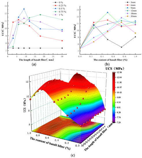 Relationship among UCS and the content and the length of basalt fiber. (a) The relationship between UCS and fiber length. (b) The relationship between UCS and fiber content. (c) The surface diagram for fiber content, fiber length, and UCS.