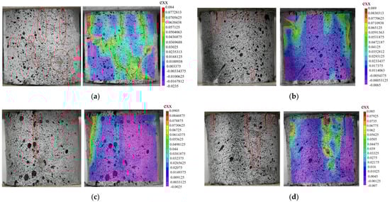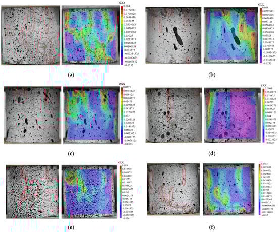 In summary, DIC technology can not only clearly identify the micro-cracks that are difficult to see with the naked eye using the strain cloud diagram and the location of stress concentration, but it can also evaluate the degree of local deformation in the material. The results of the cloud diagram are consistent with the results for the UCS. Therefore, DIC technology is a feasible method for monitoring the compressive failure of cement–soil materials. It can be a powerful tool to provide early warning before the formation of destructive cracks in a structure [49].