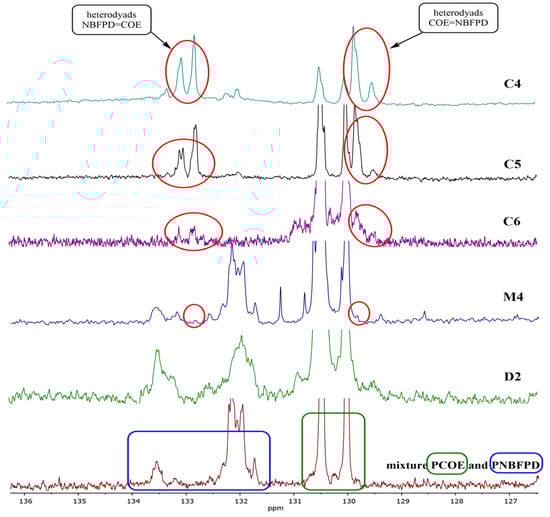 13C NMR spectra (C=C bond region) of NBFD–COE copolymers and PCOE/PNBFD mixture.