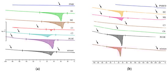 Differential scanning calorimetry (DSC) thermograms were recorded on the Mettler (Greifensee, Switzerland) DSC3+ at a rate of 10 °C min−1 under a nitrogen flow of 50 mL min−1 in a range from −100 °C to 100 °C. The data of the 2nd heating were processed using the STARe (Mettler Toledo, Columbus, OH, USA) service program. The accuracy of the measurements was 0.3 °C for temperature and 1 J g−1 for enthalpy.