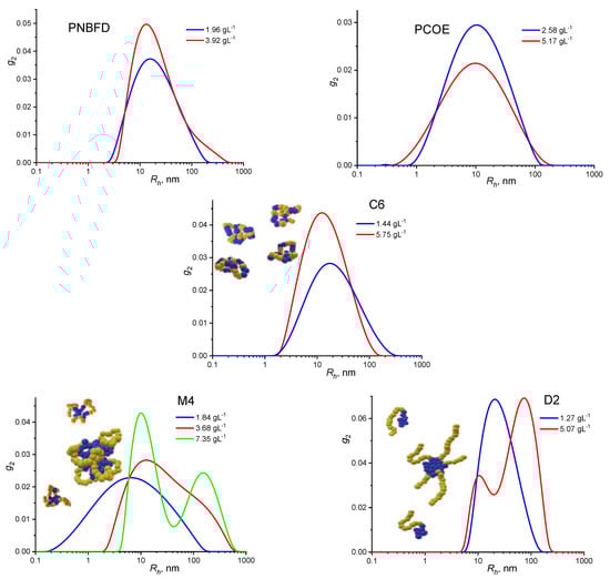 Dynamic light scattering from dilute (1.3–2.6 g·L−1, blue curves in Figure 3) solutions expectedly yields a monomodal distribution over the hydrodynamic radius, Rh, with a mean value between 7 and 21 nm that corresponds to isolated polymer coils. Increasing the polymer concentration up to 3.7–5.2 g·L−1 (red curves) does not change the picture qualitatively for both homopolymers and the random C6 copolymer, but it leads to a bimodal distribution for the diblock D2 and multiblock M4 copolymers. In the latter case, this becomes more evident when the polymer concentration increases up to 7.4 g·L−1 (green curve). Apart from individual macromolecules, the solutions of D2 and M4 contain micelles with Rh of 100–200 nm, as schematically shown in Figure 3. Note that all these solutions are well below the overlap concentration c* = 3Mw/(4πNARg3), which can be estimated for D2 (the polymer with the highest Mw = 385 kg·mol−1, Rg = 0.7 (Rh)av = 16.8 nm, and NA = 6 × 1023·mol−1) to be 32 g·L−1. It is also worth mentioning that a considerable growth in the Rh value for PCOE was found with DLS only when the polymer concentration attained 30 g·L−1 [].