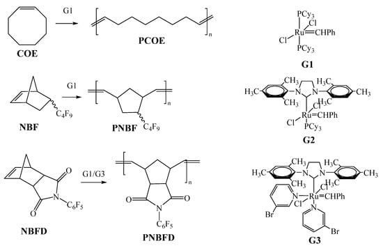 - James Feast, W.; Khosravi, E. Synthesis of Fluorinated Polymers via ROMP: A Review. J. Fluor. Chem. 1999, 100, 117–125. [Google Scholar] [CrossRef]