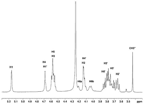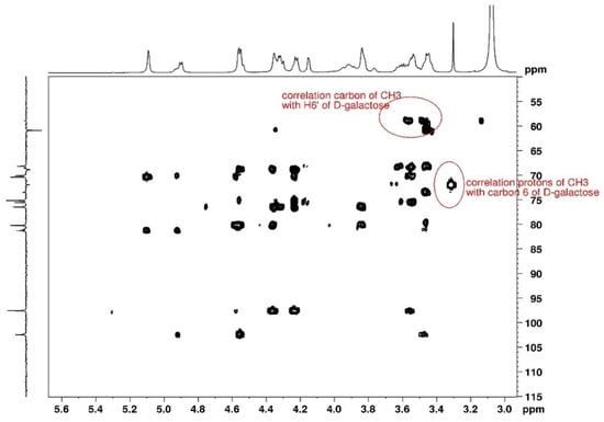 The assignments given in Table 2 are in good agreement with data from the literature [9,11,13,17]. 2D HMBC spectrum was used to locate the methyl substituent (Figure 9). The methyl group is identified on the D-galactose unit, which shifts C-3 to C-6 signals (D-galactose G″ in spectra) and the two H-6 (Table 2). This substitution is discussed in the following paragraph.