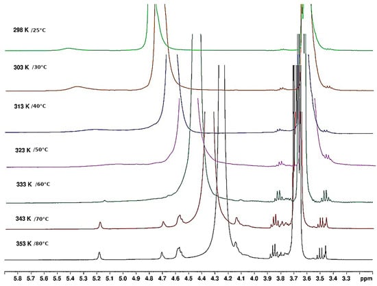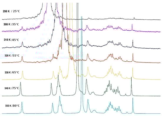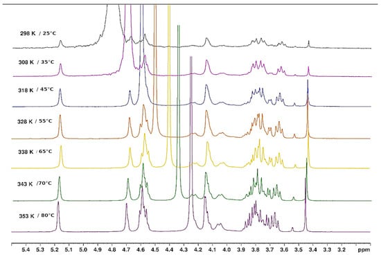Temperature increase on 1H NMR spectrum of agarose in D2O from 25 °C to 80 °C.