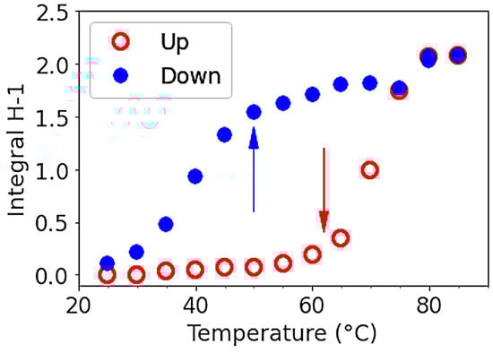 H-1 integrals of anhydrogalactose as a function of temperature on heating and cooling from 25 to 85 °C. The open red circles represent the heating process, while the filled blue circles represent the cooling process.