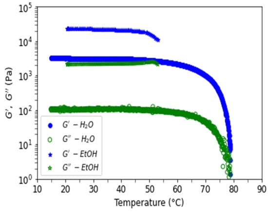 The experiments were conducted, paying particular attention to the contact between the gel and the plates by applying a small axial force between 0–0.1 N perpendicular to the plate surface. Temperature ramps were applied differently depending on the geometry used. For the smooth plate-plate geometry (Figure 1a), the temperature ramps were controlled by the APS system, while for the radial ribbed plates, temperature ramps were controlled by the FCO system (Figure 1b). No significant difference was observed between the two systems. The water and ethanol gels exhibited different behaviors during the temperature ramps. During the temperature ramps, the water and ethanol gels behaved differently. The water gels did not require any special attention during the experiments, but the ethanol gel showed a drastic change in sample size as the temperature increased due to solvent evaporation. This made rheometric measurements for the ethanol gel difficult as the temperature increased. Due to this difficulty in controlling the integrity of the ethanol gel, the present study was limited to 50 °C for the ethanol gel.