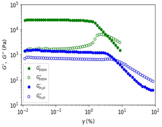 To complete the gel study, Figure 16 shows the loss and viscous moduli as a function of the applied strain for a constant frequency of f = 1 Hz. From the amplitude sweep, a weaker linear regime was observed for the ethanol gel (γ~1%) than for the water gel (γ~3%). For both gels, a reduction in moduli at high amplitudes of oscillation is present but with a difference in the loss modulus. Indeed, there is an overshoot in the loss modulus for the ethanol gel but not for the water gel. We interpret this difference as a modification of the structural organization of the water gel and a destruction of the structure of the ethanol gel. This is confirmed by the subsequent experiments done on the ethanol gel, where the viscous and the elastic moduli dropped by a factor of 10 and where the oscillatory stress and strain curves no longer resembled sinusoidal curves, even in the linear regime of the gel identified initially in Figure 16. This interpretation is in agreement with the literature [29,30,31], and it is in favor of the plasticizing role of water in agarose gel. Due to the absence of water in the ethanol gel, it behaves like a brittle gel.