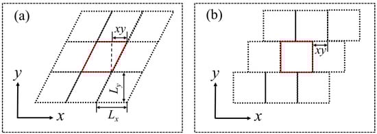 A two-dimensional sketch of periodic boundary conditions (PBCs) for triclinic box used in the SLLOD algorithm. (a) Triclinic box (red solid line) and its images (black dotted lines) due to PBCs; (b) Lees-Edwards PBCs, which are equivalent to the PBCs used with the triclinic box in (a).