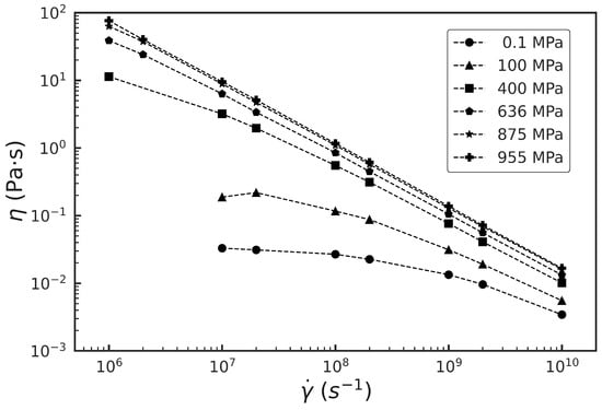Figure 3 shows the NEMD simulation results for the shear viscosity of squalane for different shear rates and pressures MPa at 293 K. Shear viscosity is calculated as , where is the component of the stress tensor. At all pressures, squalane exhibits a clear shear thinning behavior evident by a decreasing viscosity with increasing shear strain rate. Our previous papers [17,18] showed that phenomenological models and the associated molecular mechanisms that best describe the observed shear thinning behavior can be different at different pressures. For low pressures 100 MPa, where the Newtonian viscosity is small, the viscosity of squalane is better fit by power-law models such as Carreau model and Ostwald-de Waele model [53,54], which predict a power-law shear thinning as a function of rate: , where is a characteristic shear rate, and the exponent n is between 0 and 1. For low rates , reduces to the Newtonian viscosity . For rates , shows power-law behavior. Our earlier work showed that the viscosity extracted from the Newtonian plateau reached in simulations and via the fit to the Carreau model is in excellent agreement with the Newtonian viscosity measured in experiments [17,18]. In such models, shear thinning is attributed to changes in molecular order. For example, an increase in the molecular alignment along the flow direction with increasing rate can reduce the rate of collisions between molecules, and thus decrease the fluid viscosity.