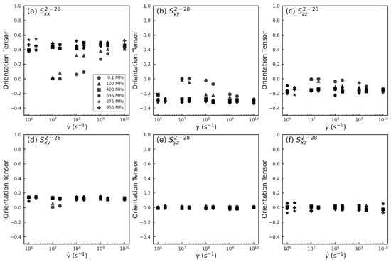 To illustrate, Figure 4 shows the intramolecular orientation tensor for the atom pair 2−28 (see Figure 1) for different rates and pressures. For pressures 100 MPa, , , and (Figure 4a–c) start at ≈0 at the lowest strain rates probed () and gradually increase or decrease with increasing rate, before plateauing to a non-zero value at the highest rates (). This behavior signals a gradual shift in the orientation of the atom pair 2−28 from a random orientation to an ordered orientation as shear rate increases from to . The high-rate plateau values for , , and are positive, negative, and negative, respectively, which indicates that the atom pair 2−28 orients along the flow direction while being perpendicular to the velocity gradient and vorticity directions.