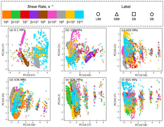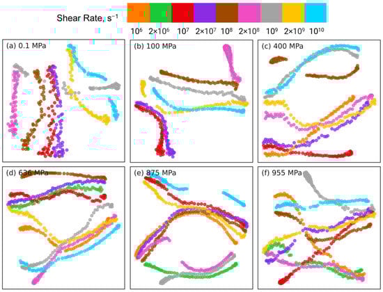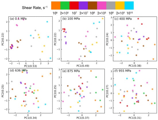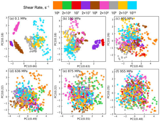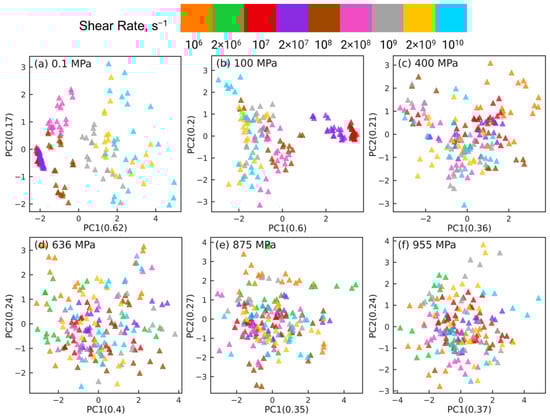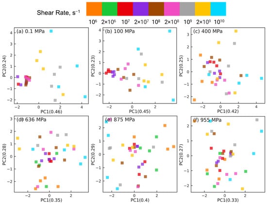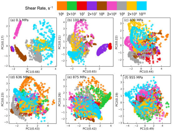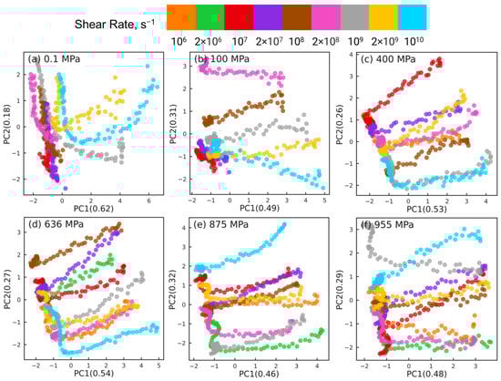 Figure 12 shows the PCA results for far pairs at different pressures. A distinct picture emerges: for all pressures, the far atom pairs are grouped together into clusters that are separable by shear rates. At low pressures ( 100 MPa), the separation between these clusters is more significant, and the clusters are organized along the PC1 axis by strain rate, similar to all other pair types (e.g., side-backbone, end-backbone, short backbone-backbone, and the near long backbone-backbone pairs). On the other hand, Figure 12c–f show that at high pressures 400 MPa, while the clusters of atom pairs associated with the same rate are still separable, their distribution in the low-dimensional space is random and not organized along either of the principal components. In other words, the clusters of atom pairs identified by the strain rate do not show a correlation with changes in the rate, as observed for low pressures in Figure 12a,b, where atom pairs are organized along PC1 axis by increasing or decreasing shear rate.