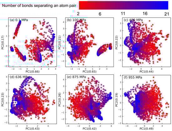 While the long backbone-backbone atom pairs associated with different strain rates are mixed together in Figure 9, the overall large number of these pairs and the wide distribution of separation bonds (from 2 to 21) associated with these pairs might blur the information in the low-dimensional space. Therefore, we divide this group into 20 sub-groups where each group is characterized and distinguished by an integer bond separation number representing the number of bonds separating an atom pair. Figure 10 shows the same PCA dimension reduction results shown in Figure 9, except, instead of strain rate, the symbols are colored with the number of bonds separating the atom pair (i.e., the bond separation number). A red-blue color gradient scale is used where red represents smaller bond separation numbers (e.g., ) and blue represents higher bond separation numbers (e.g., ). At low pressures MPa, the red and blue symbols appear mixed with no clear organization along either principal components. Interestingly, unlike Figure 9c–f, a pattern in the organization of atom pairs for higher pressures MPa emerges in Figure 10c–f: the atom pairs are organized along the PC1 axis in increasing or decreasing order by their bond separation number. In each case, the far-separated atom pairs with large b values (blue symbols) are clearly separated from the near-separated atom pairs characterized with small b values (red symbols).