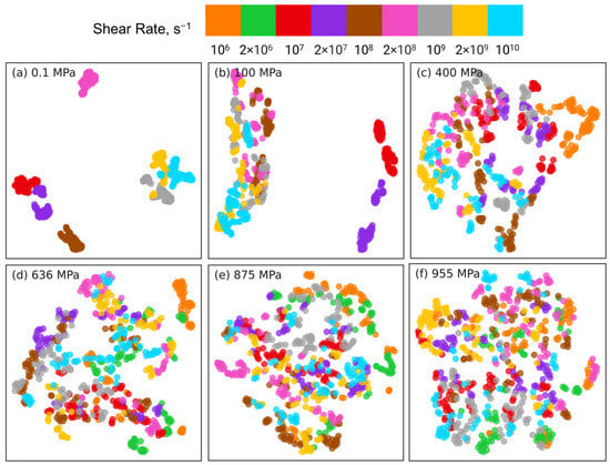 Figure 18 shows the t-SNE dimension reduction results for the intermolecular atom pairs at different pressures. Unlike PCA, t-SNE is able to separate the atom pairs associated with different strain rates for all rates at the low pressures MPa. For all pressures, the atom pairs associated with the same strain rate distribute in a linear manner across the two-dimensional t-SNE plot. At low pressures, there is a degree of organization in the separation of different “strands” of atom pairs associated with the same shear rate. However, at high pressures, there is no consistent pattern in the organization of these strands, which is similar to the linear dimension reduction results obtained via PCA.