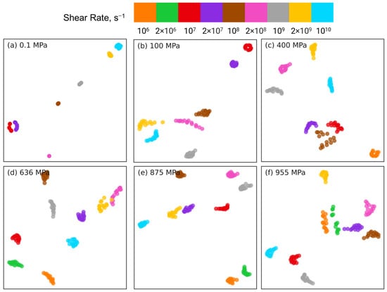 Dimension reduction using t-SNE of 61 intermolecular pair orientation tensors describing the intermolecular structure of squalane sheared at six different pressures: (a) 0.1 MPa, (b) 100 MPa, (c) 400 MPa, (d) 636 MPa, (e) 875 MPa, and (f) 955 MPa. Each point represents one pair orientation tensor. Different colors denote different shear rates as shown in the legend panel at the top.