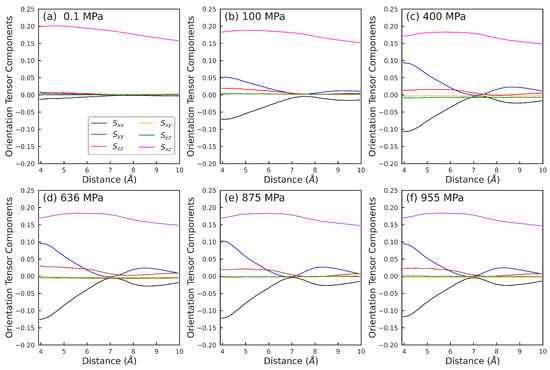 Figure 16 shows the 61 intermolecular orientation tensors at a high pressure MPa for different strain rates . The 6 sub-figures show the 6 tensor components: , , , , , and . Figure 16a–c show the variation of the diagonal elements , , and as the separation distance d between the atoms is increased. For small , these components are different for different rates and assume non-zero values; the deviation from 0 is larger for higher strain rates. As d increases, , , and approach 0 in a non-monotonic manner. Variations in these components with rate diminishes with increasing d such that for , , , and are nearly the same for all rates. The off-diagonal components , , and do not change significantly with either rate or d.