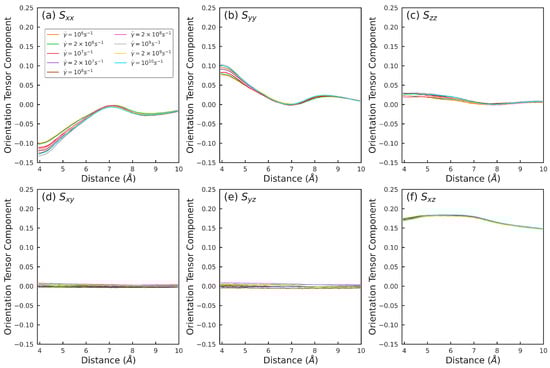 Intermolecular orientation tensor components: (a) , (b) , (c) , (d) , (e) , and (f) vs. distance between the atoms belonging to two different squalane molecules at 636 MPa and strain rates noted in the legend in (a). Within each sub-figure, each line is represented with 61 points corresponding to the 61 atom pairs encapsulating the intermolecular structure information. x, y, and z represent the flow, velocity gradient, and vorticity directions respectively.