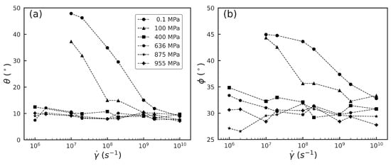 The PCA and t-SNE results suggest the saturation of the molecular orientation order associated with squalane sheared under different strain rates at high pressures. Motivated by this, in order to quantify the degree of evolution in the molecular orientation with shear rate for different pressures, we extract two angles, and , associated with the intramolecular and intermolecular orientation, respectively. We choose a far long backbone-backbone atom pair, 2–28, to compute the angle between the squalane molecule axis and the flow direction (). Figure 19a shows that at low pressure 100 MPa, decreases slowly from ∼ at strain rate to ∼10 at , indicating that the squalane molecules gradually align along the flow direction with increasing shear rate. In contrast, for high pressures 400 MPa, is ≈ regardless of the strain rate, indicating that the squalane molecules are already well-aligned and the system exhibits a saturated intramolecular orientation order. These trends are consistent with the PCA and t-SNE dimension reduction results shown in Figure 12 and Figure 14.