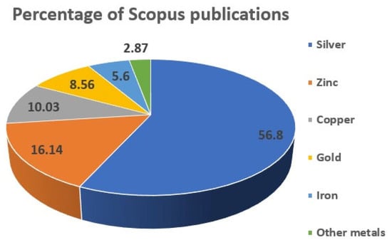 It may be noted that the investigation of antibacterial properties of metal nanoparticles started with silver and copper in 2003, followed by gold nanoparticles in the same year. The number of Scopus publications related to metal nanoparticles research has increased significantly since then, with silver being the most studied metal and having the highest percentage of Scopus publications at 56.8%. Zinc, copper, and gold were also investigated, but to a lesser extent, with 16.1%, 10%, and 8.6% of the Scopus publications, respectively (Figure 1). Iron and other metals were also studied but had lower percentages of Scopus publications. The data suggest that the scientific community has shown significant interest in investigating the antibacterial properties of metal nanoparticles. Silver has emerged as the most extensively studied metal nanoparticle for antibacterial purposes, possibly due to its broad-spectrum antimicrobial activity, low toxicity, and relatively lower cost than gold. The lower number of publications for other metals may suggest that they are less promising compared to silver, but it is essential to note that this may not reflect the quality or significance of the research.