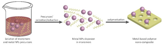 The in-situ polymerization method involves the simultaneous polymerization of monomers and the reduction of metal ions to form copper nanoparticles within the polymer matrix (Figure 4). One common in situ polymerization methods is emulsion polymerization [159]. This method involves the dispersion of a hydrophobic monomer in water using surfactants. Metal salts are then added to the emulsion, followed by the addition of a reducing agent to initiate polymerization and nanoparticles formation [160,161].
