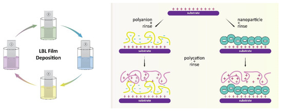 Figure 5 illustrates the process of layer-by-layer assembly mechanisms, which demonstrate the alternate deposition of positively and negatively charged components onto a substrate. The LBL assembly allows for the introduction of various nanospecies, such as inorganic nanoparticles (NPs) and polymers, at the same time with high loading in the assembled layers. The assembly of each layer can be easily modulated to achieve the optimal structure for a specific application, and the prepared layers can be assembled with controlled variable thicknesses for generating biocompatible coatings. The ability of LBL to control the coating thickness, properties of the nanocomponents, and economic use of raw materials make the assembly tool greatly superior to other methods. This approach provides the opportunity to combine the electronic, optical, and magnetic properties of inorganic nanostructures with unique physical responses. The resulting LBL-based thin films have been applied to various applications, including drug delivery systems and thin membranes.