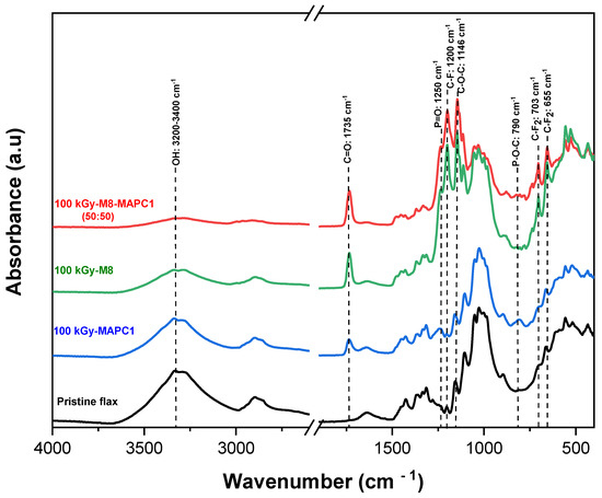 FTIR spectra of pristine flax fabric, irradiated flax fabrics at 100 kGy and treated with MAPC1, M8 and with M8/MAPC1 (50:50) mixture (10 wt%_65 °C_24 h).