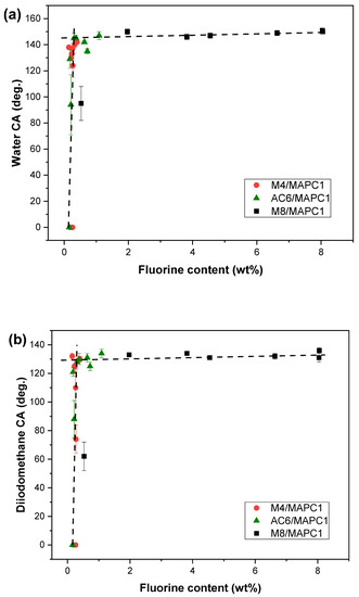 Evolutions of (a) water and (b) diiodomethane contact angles versus grafted fluorine content for various flax grafted by M4/MAPC1 (●), AC6/MAPC1 (▲) and M8/MAPC1 (◼) (dotted lines are guidelines for eyes).