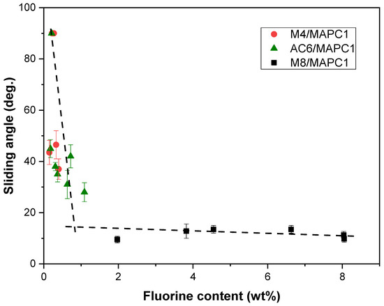 Evolutions of the sliding angles according to the fluorine content for various flax treated with M4/MAPC1 (●), AC6/MAPC1 (▲) and M8/MAPC1 mixtures (◼) (dotted lines are guidelines for eyes).