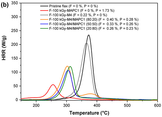 The grafting with only MAPC1 polymer chains onto flax fabrics irradiated at 20 kGy (Figure 8a) resulted in a 0.22 wt% of phosphorus content and produced decreases in both pHRR (from 230 to 131 W/g) and pHRR temperature (from 370 to 312 °C). The THR value also decreased to 6.8 kJ/g while the char residue increased to 21 wt% versus 11 wt% for pristine flax fabrics. At 100 kGy (Figure 8b), higher phosphorus content was achieved (1.77 wt%), and sharp decreases in pHRR (from 230 to 47 W/g), pHRR temperature (from 370 to 255 °C) and THR (from 9 to 2.9 kJ/g) were noted. Char content increased to 40 wt%.