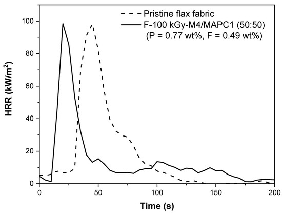 Compared to pristine flax, the fabrics modified with the M4/MAPC1 50/50 mixture induce a significant decrease in ignition time (TTI) from 28 s to 14 s (Figure 10). No evolution of pHRR was observed for the treated fabric in comparison with that of the pristine fabric (98 and 102 KW/m2, respectively). Actually, the pHRR for thermally thin materials as fabrics was mainly dependent on the sample mass and the heat of combustion. Indeed, in another work [50], a phenomenological model to calculate the pHRR of thermally thin materials was proposed. Using this model and considering the data listed in Table 4, pHRR was found to be 122 and 91 kW/m2 for untreated and treated fabrics, respectively. This is in acceptable agreement with the experimental values.