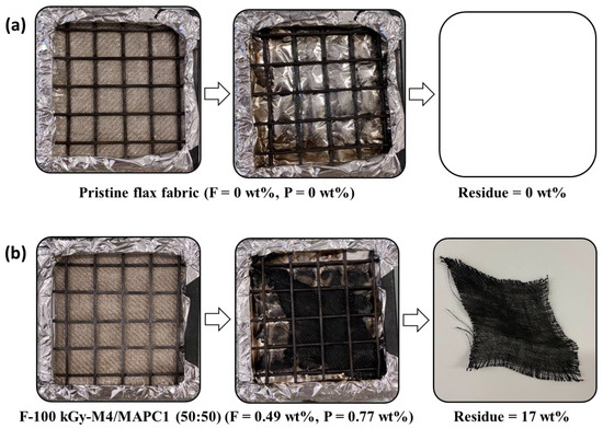 Pictures of residues after cone calorimeter tests of (a) pristine flax and (b) irradiated flax at 100 kGy and treated with M4/MAPC1 50/50 mixture for 24 h.